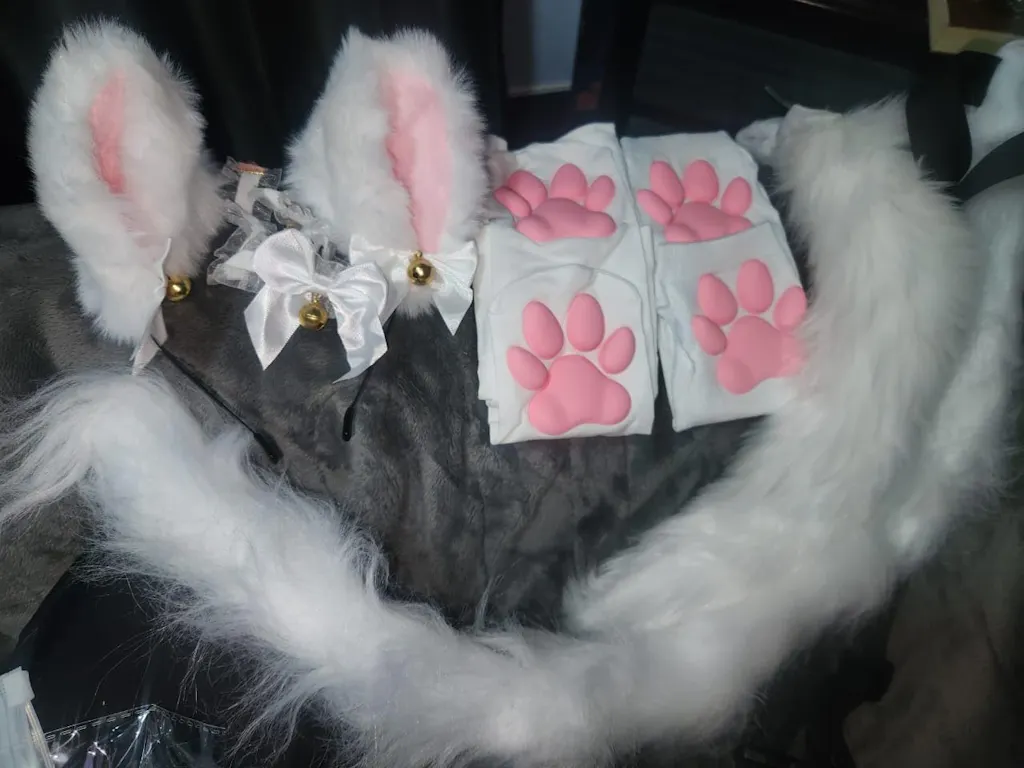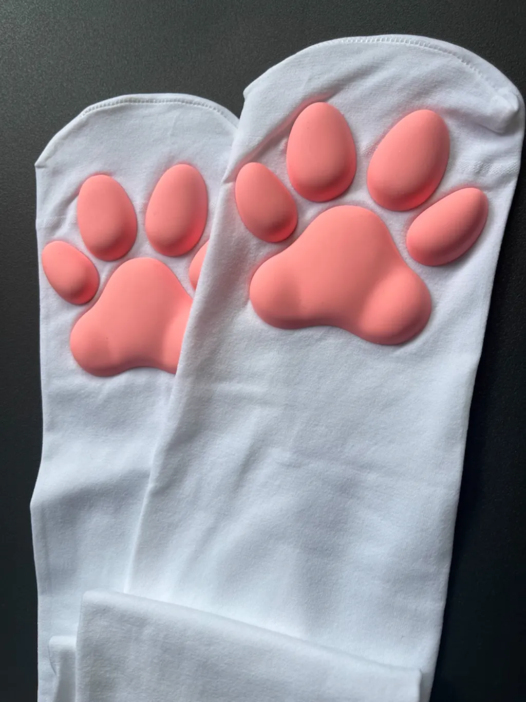 super cute! they come up to around half of my thigh and there's a small rubber-ish pattern at the top so they stay in place. The paws kinda feel like a solid rubber texture? i thought they'd be squishy but they barely are. they're uncomfortable (kinda hurts tbh) to walk on though would only recommend using them for pictures and stuff. overall good purchase <3