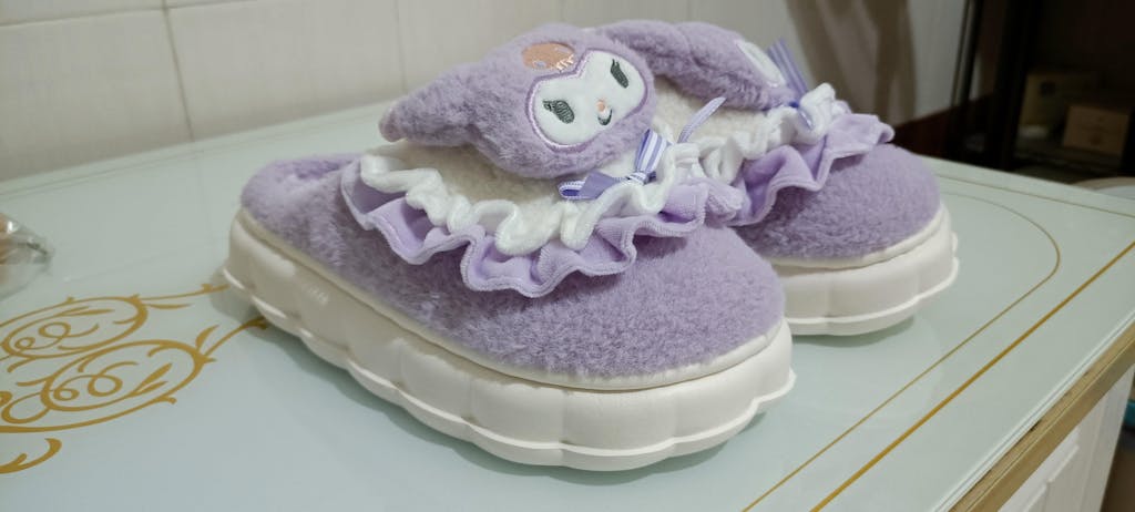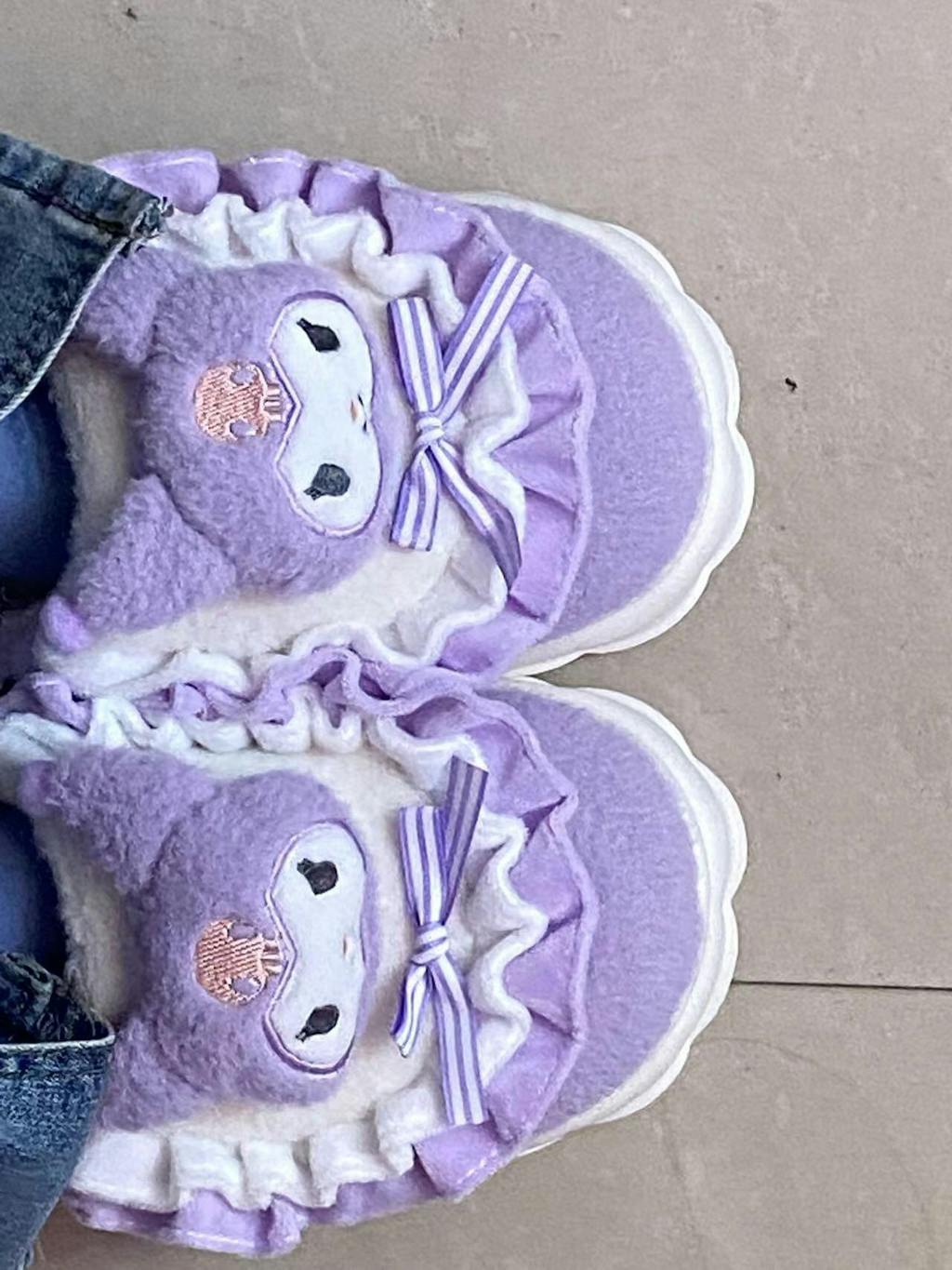 Step into a world of comfort and cuteness with these plush Kuromi slippers. Available in alluring purple, the slippers make an adorable statement, appealing to both character and kawaii enthusiasts. They offer the perfect blend of fun and functionality, uplifting ordinary wear into an extraordinary, playful experience.